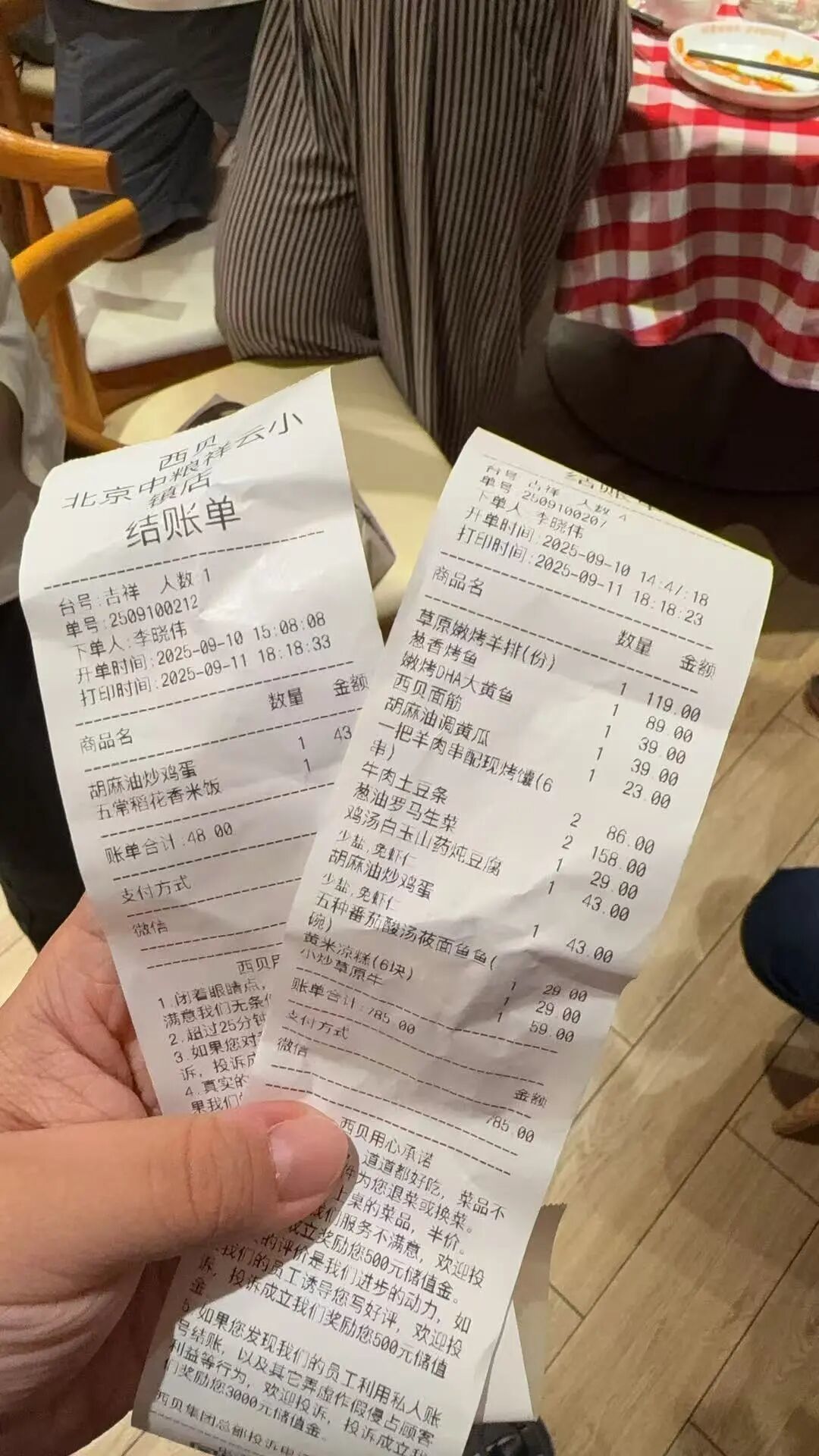 9月11日,在西贝位于北京顺义祥云小镇的门店内,西贝创始人贾国龙情绪略显激动地向《每日经济新闻》记者表示,他手里拿着两张长长的罗永浩点单流水单,在他身后就是此前罗永浩用过餐的包间。