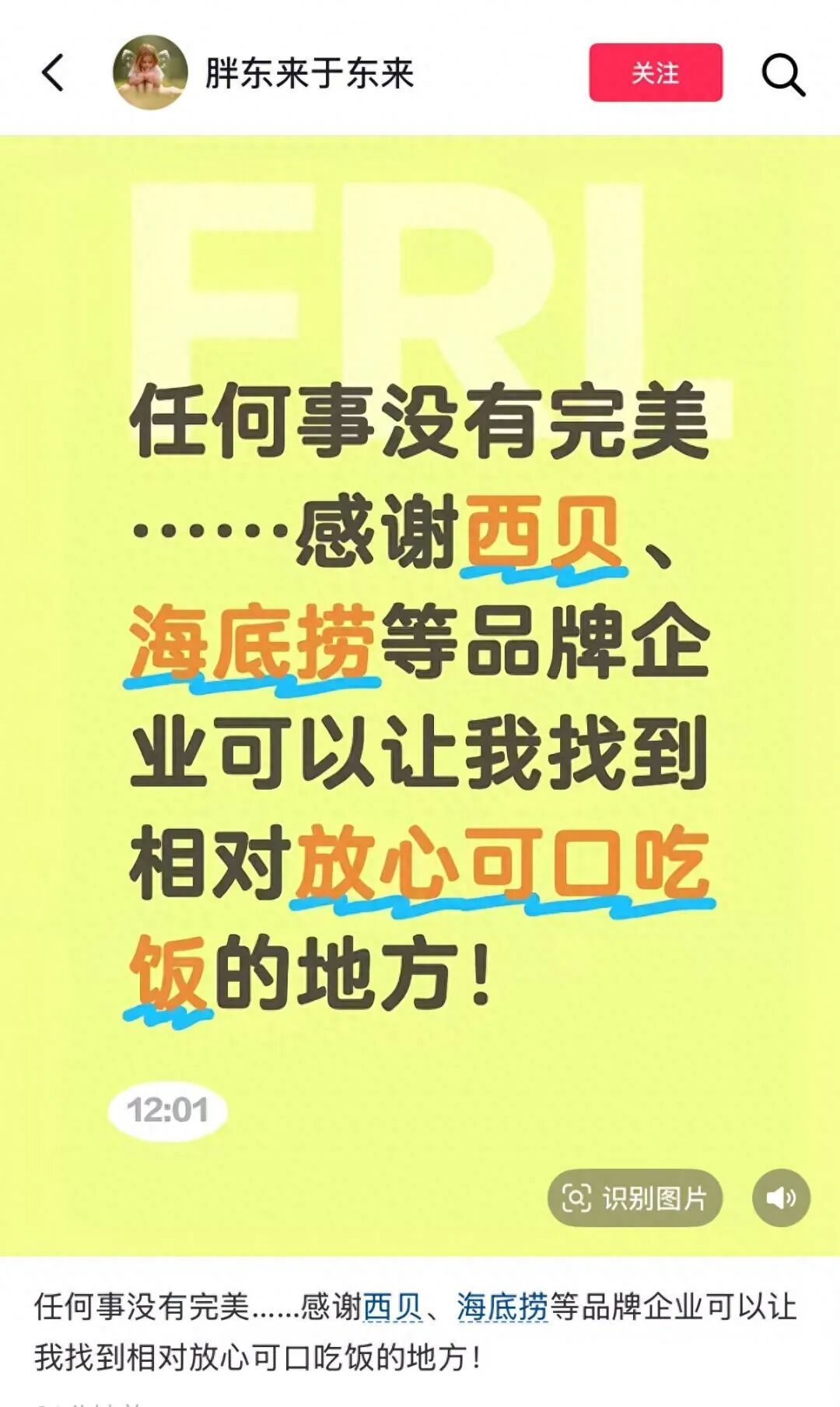 9月12日,胖东来CEO于东来社交媒体发文表示:“任何事没有完美……感谢西贝、海底捞等品牌企业可以让我找到相对放心可口吃饭的地方!”