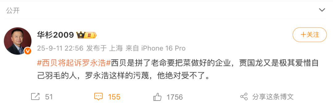 9月11日晚间,华与华营销咨询有限公司董事长华杉发微博表示,西贝是拼了老命要把菜做好的企业,贾国龙又是极其爱惜自己羽毛的人,罗永浩这样的污蔑,他绝对受不了。