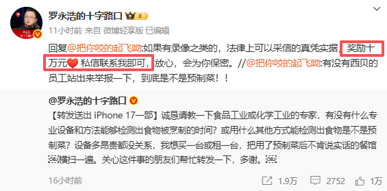 随后,罗永浩还发布10万元悬赏,公开征集西贝使用预制菜的 “真凭实据”。