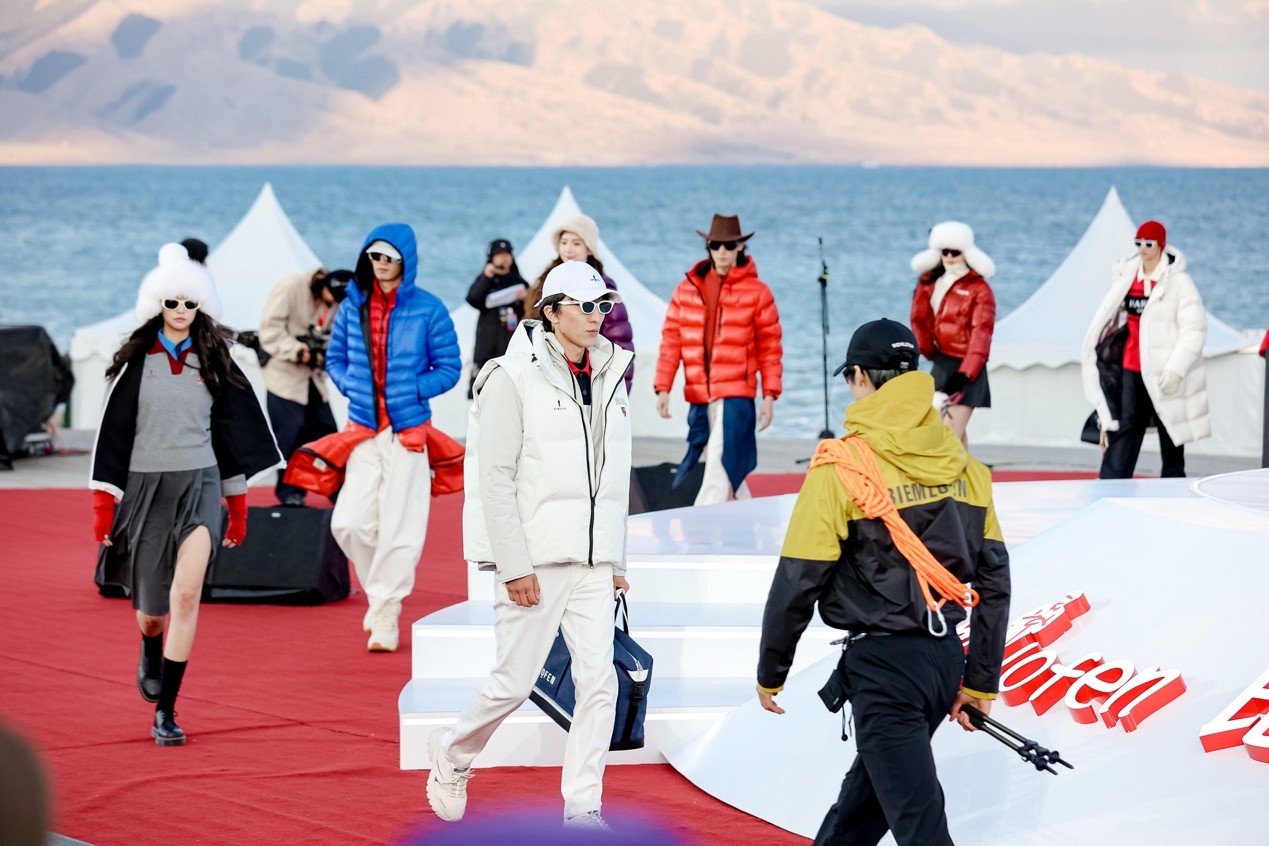 发布会现场,比音勒芬品牌大使胡一天、李兰迪现身赛里木湖,与《时尚芭莎》等时尚媒体见证新疆鹅绒的卓越品质。