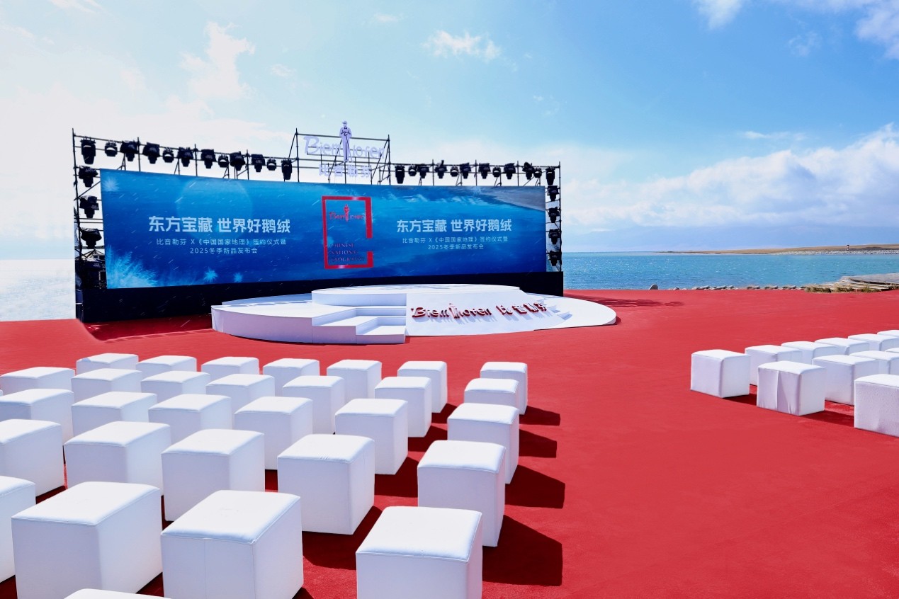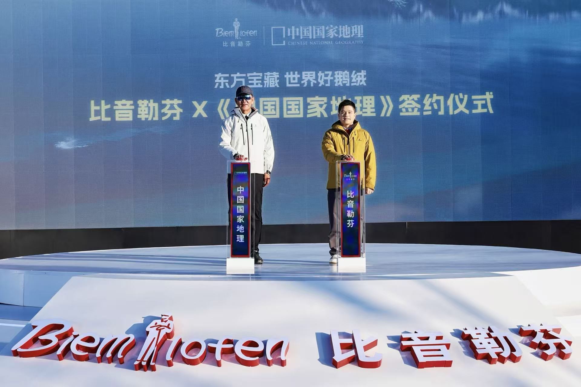 9月9日,在中国高端运动户外服饰品牌比音勒芬于被誉为“大西洋最后一滴眼泪”的新疆赛里木湖点将台,隆重举办了「东方宝藏 世界好鹅绒」比音勒芬×《中国国家地理》签约仪式暨2025冬季新品发布会,正式发布比音勒芬2025鹅绒系列。中国国家地理杂志社社长兼总编辑李栓科、中国国家地理发行公司总经理李宁、中国服装协会常务副会长谢青、中国纺织信息中心副主任李波、比音勒芬集团总经理谢邕、比音勒芬品牌大使胡一天、李兰迪、中央广播电视总台主持人大赛金奖得主蔡紫等百余位嘉宾齐聚赛里木湖畔,共同探讨来自东方的世界好鹅绒。