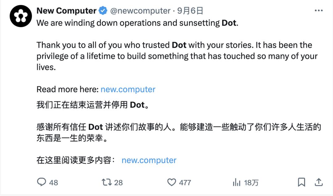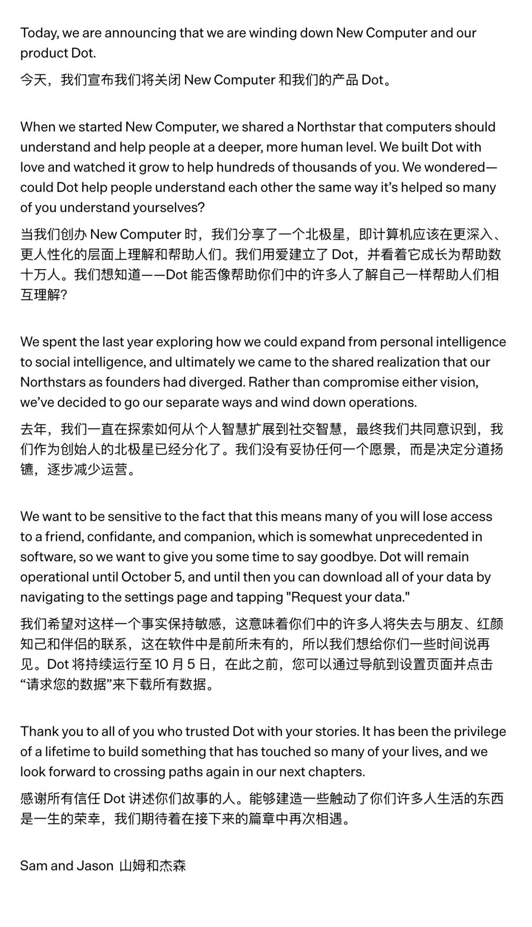 Dot明确决定关停,没有模棱两可的表述,直接感谢用户的陪伴,并使用了“道别”“朋友”等词汇。