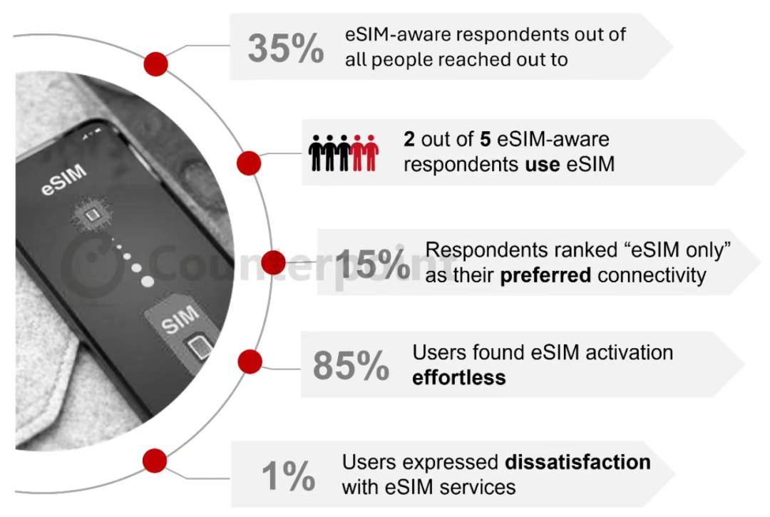 Counterpoint研究总监Mohit Agrawal表示:“尽管eSIM技术有明显优势,如增强的灵活性和多SIM卡功能,但消费者仍不愿完全接受,相当一部分消费者不了解eSIM的全部潜力和优势。61%的受访者将eSIM列为最不喜欢的SIM卡连接选项。由于设备兼容性限制和缺乏立即切换需求等因素,许多人仍青睐传统SIM卡或混合型号。”