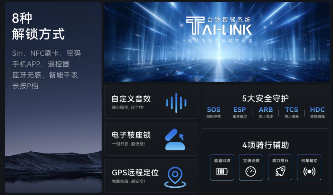 一是转向“情绪价值”。既然车不能“跑得快”,那就让它“更聪明”。爱玛在一些车型上提升骑行的“无感”便捷与全场景适应性,通过自动感应大灯、上下坡防护系统以及TCS防侧滑等功能,强调行驶过程中的智能化属性。雅迪聚焦“主动干预式”安全,宣传“方舟安全科技”,整合TCS自动防滑与HDC智能陡坡缓降等功能,在湿滑、陡坡等高风险场景下主动介入,提高电动车可操控性。台铃在智能化方面投入大,通过GPS + 北斗双模定位和物理电子双重锁提供强大的智能防盗系统,接入鸿蒙智联、将核心智驾数据上云以支持未来OTA持续升级,有“新势力品牌”的感觉。