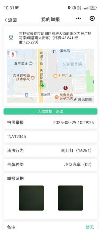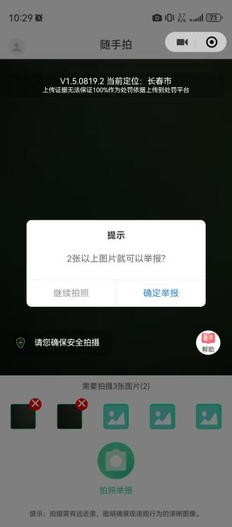 2)非严管街:当天、同一地点(举报地点经纬度一定范围内)、同一车牌号,举报违法停车行为,需分两次上传违法数据。按照规定,两次举报时间应间隔在10分钟以上,因数据处理传输需要时间,建议两次间隔在20分钟以上。举报成功两次后,其余举报均不再上传。上传举证图片:二次上传中包含三张图片,第一张、第二张取首次提醒的第一张(车头)、第二张(车尾);第三张(车侧面)取二次上传(即当前数据)的第三张,二次上传图片不足三张的取二次上传的最后一张。