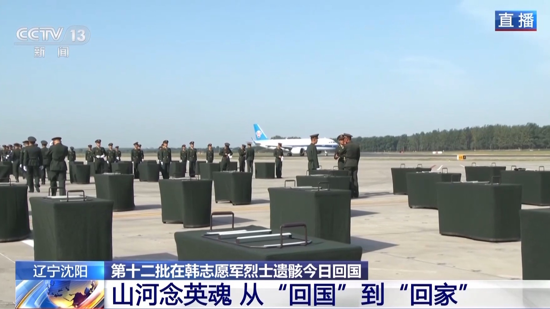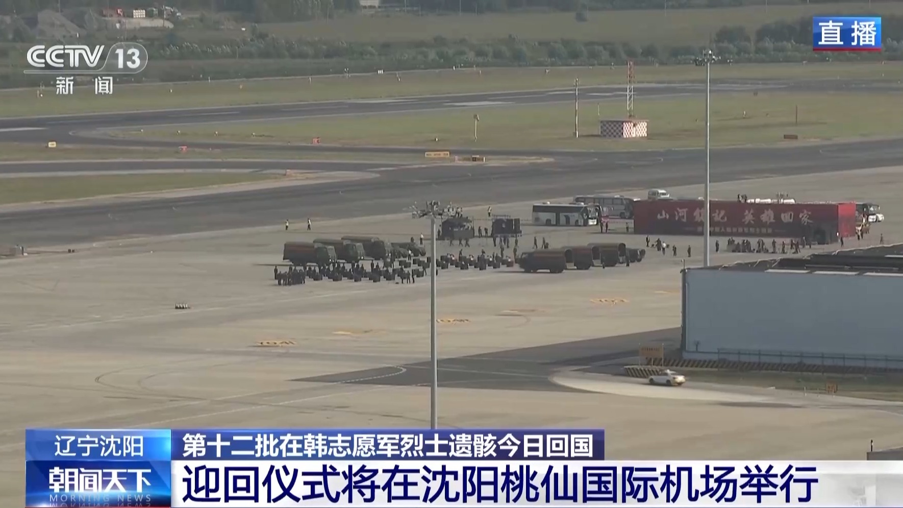 总台记者 杨海灵:沈阳桃仙国际机场的专机停机坪是第十二批在韩中国志愿军烈士遗骸迎回仪式的举办地。稍后,搭载30位在韩志愿军烈士遗骸及其遗物的专机将在此降落。