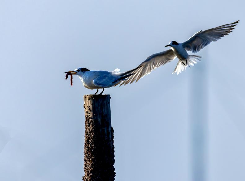 蓝天为幕,木桩作台,中华凤头燕鸥衔红虫静立,另一只振翅而来,演绎自然灵动瞬间。臧绍喜 摄