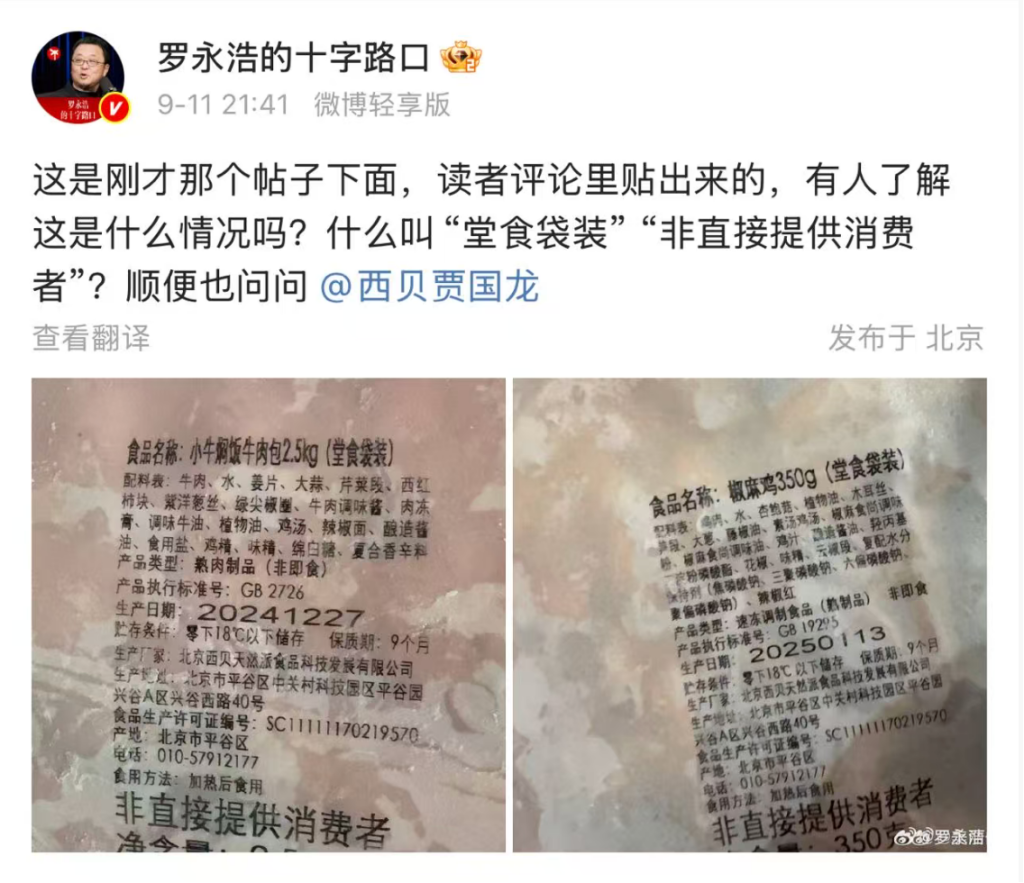 9月11日晚间,罗永浩微博贴出两张网友提供的图片,显示为堂食袋装的焖饭牛肉包和椒麻鸡。不少网友评价,这不就是大众所认知的预制菜?也有网友称,西贝这是钻了国标预制菜定义的空子。