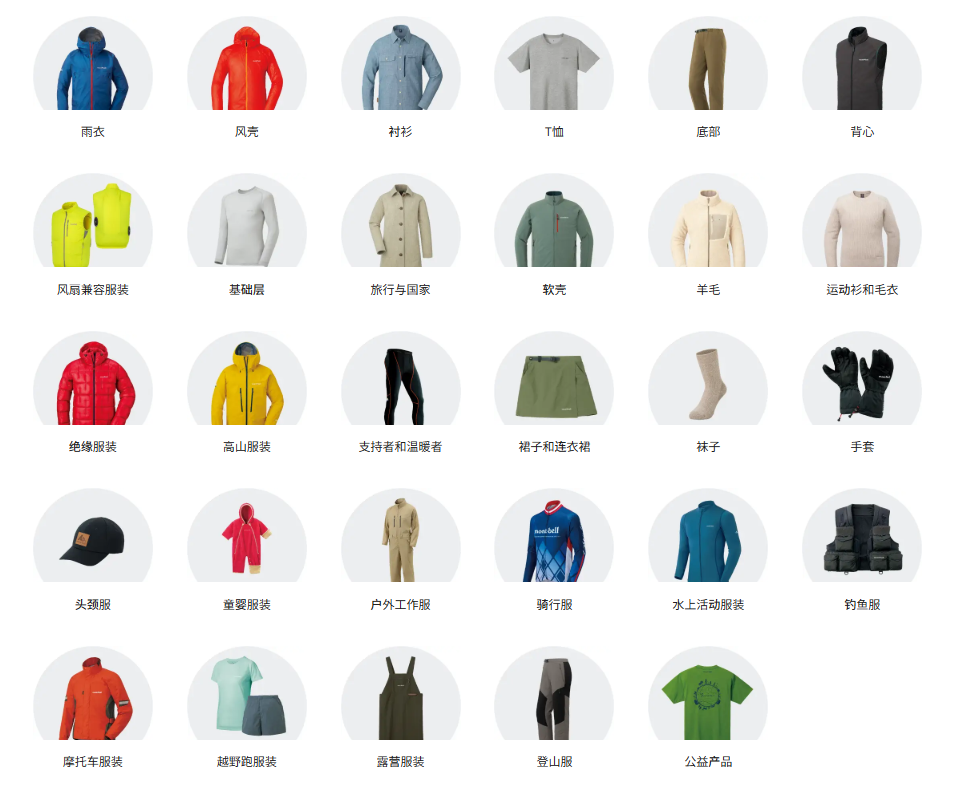 首先,montbell并非专注于某一品类,而是提供丰富的产品线,涵盖羽绒服、冲锋衣、抓绒衫、登山包、抓绒围巾、防晒衣、保温杯等,覆盖了滑雪、登山、徒步、露营、骑行、攀岩、钓鱼等大部分户外运动。