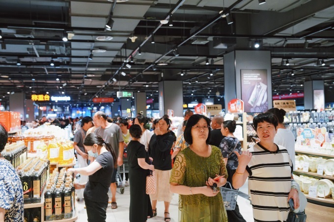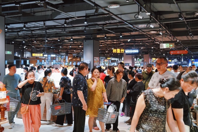 熟食烘焙区热闹非凡。现场制作的各种美食香气扑鼻,小龙虾专柜人气十足。烘焙工坊从无到有,自制SKU增加至50支,原料严格遵循健康标准。