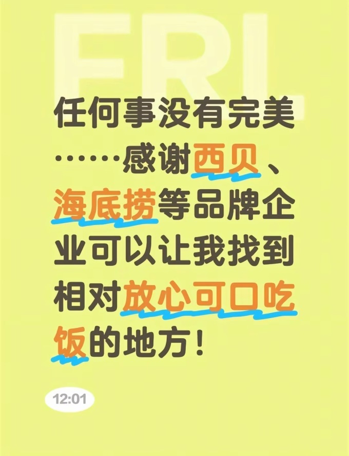 9月12日,胖东来创始人于东来在社交媒体发文称:“任何事没有完美......感谢西贝、海底捞等品牌企业可以让我找到相对放心可口吃饭的地方!”