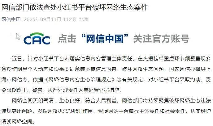 网信部门依法查处小红书平台破坏网络生态案件-网信中国