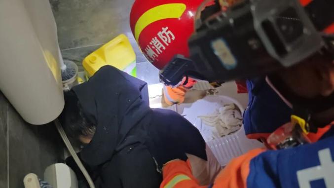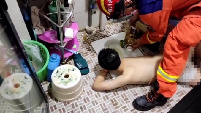 消防员到场后从家长处了解到,男孩洗澡时因洗面奶掉进了蹲便器,便伸出手臂掏取,结果被牢牢卡住。