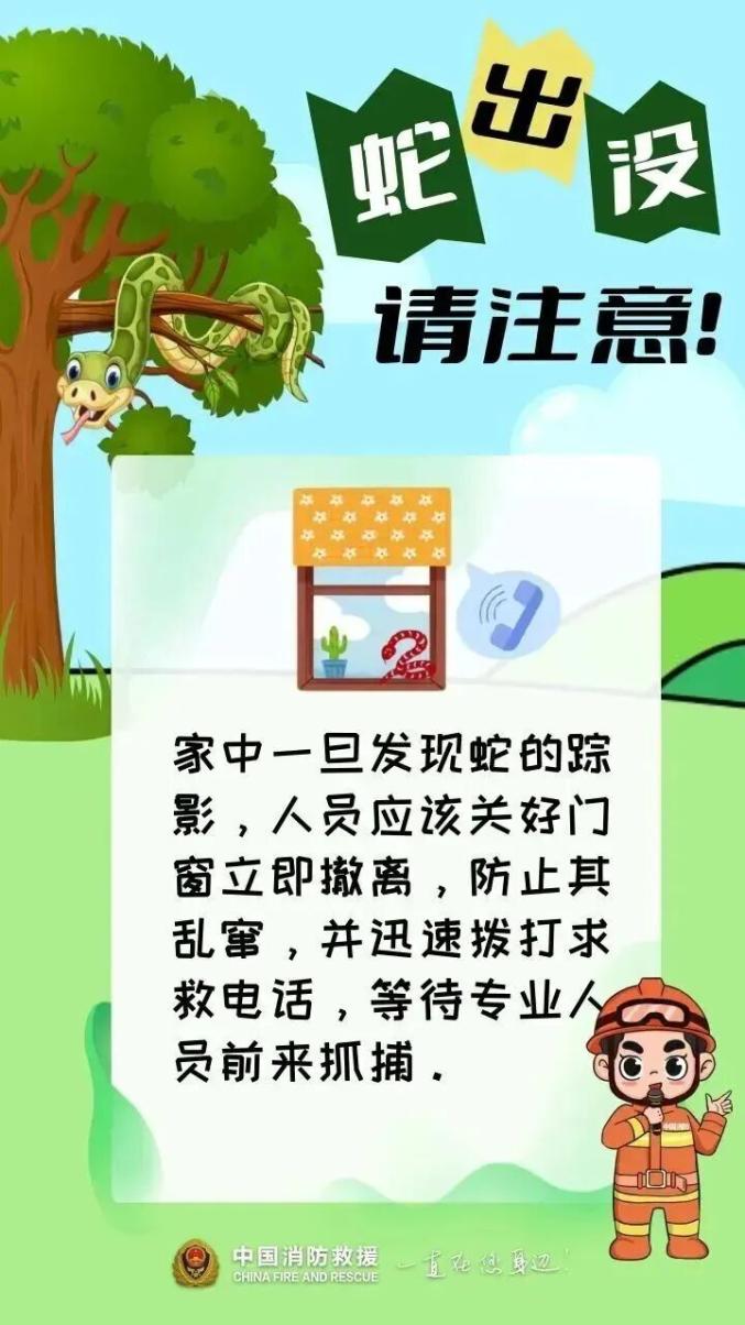 贵贵提醒,每年6到9月是蛇类活动的高峰期,居民在家要及时清理阳台、庭院的杂物,封堵门窗、墙角的缝隙,避免蛇类潜入。若发现蛇类踪迹,切勿自行捕捉或驱赶,应第一时间拨打119报警,由专业人员处置,确保自身安全。