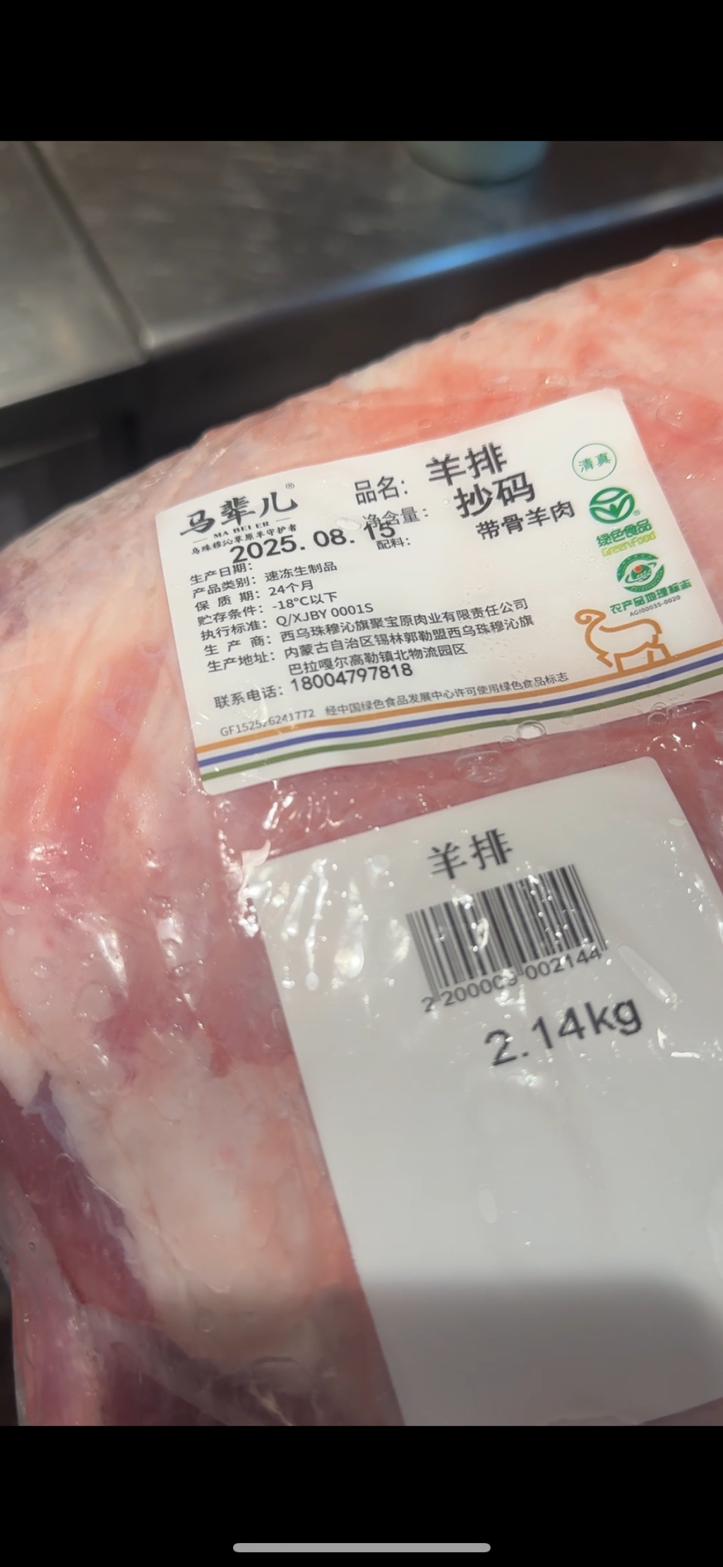 为弄清楚是否为预制菜,点餐后记者来到厨房观看餐品制作过程。制作“草原嫩烤羊排”时,工作人员给羊排涂上“玉米糊”和辣椒酱料,然后放入烤箱烤制。记者注意到,羊排包装上写着:速冻生制品,带骨羊肉。