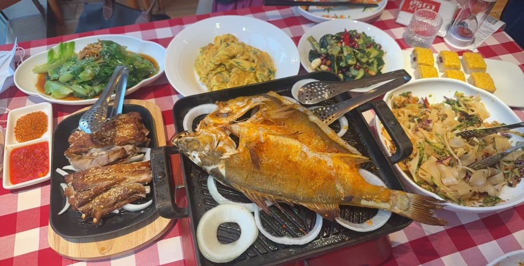 记者点了西贝面筋、胡麻油调黄瓜、黄米凉糕、草原嫩烤羊排、一把羊肉串配现烤馕、胡麻油沙葱炒鸡蛋、鸡汤白玉山药炖豆腐、葱油罗马生菜、五种番茄酸汤莜面鱼鱼、葱香烤鱼,共10道菜(备注:另有3道罗永浩点的菜品,店内无供应)。