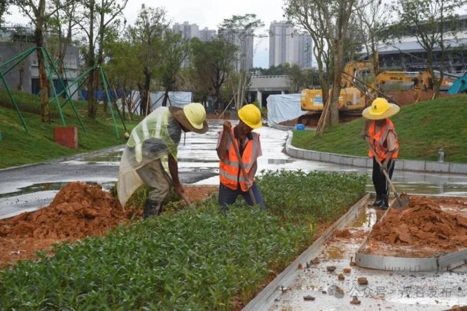 9月10日上午,记者走进项目施工现场,看到现场一派繁忙攻坚景象。300多名施工人员分布在各个作业面,场馆建设已进入外立面与室内装修阶段。