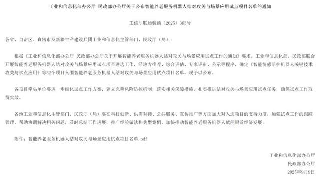据悉,试点单位需在入围名单确定之日起2年内完成结对攻关与场景应用试点任务。试点项目成果将通过工业和信息化部、民政部网站,以及“机器人+”供需对接与应用推广公共服务平台、全国养老服务信息平台等渠道进行展示推广。