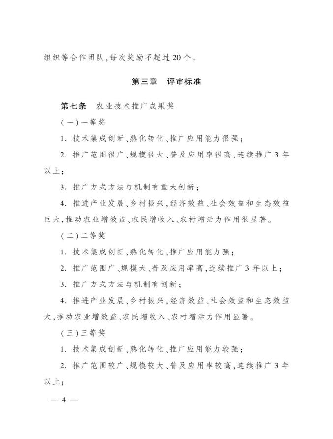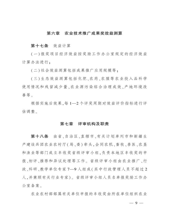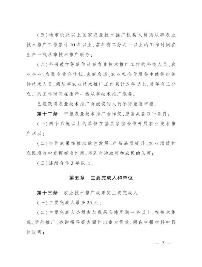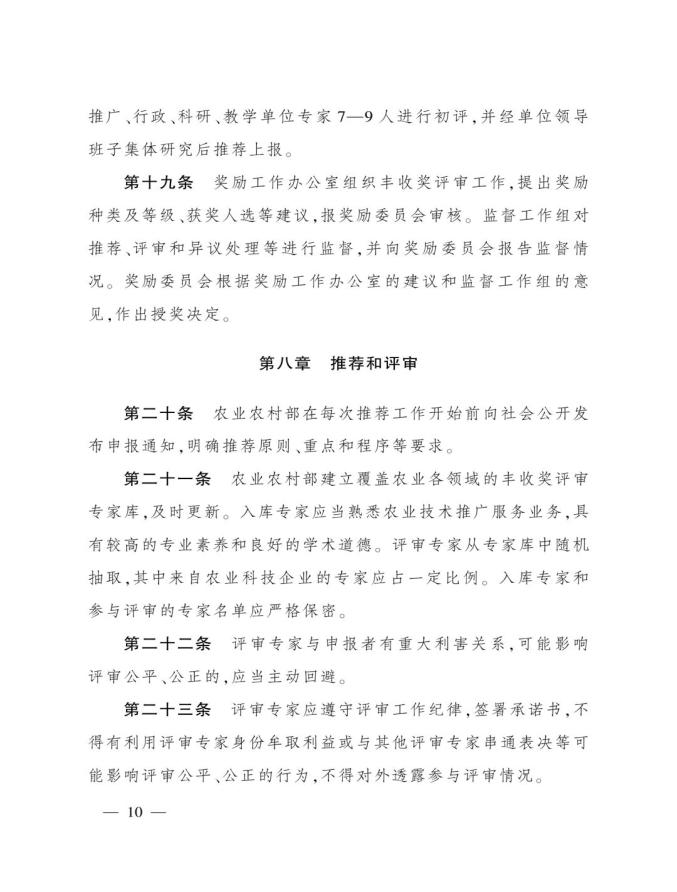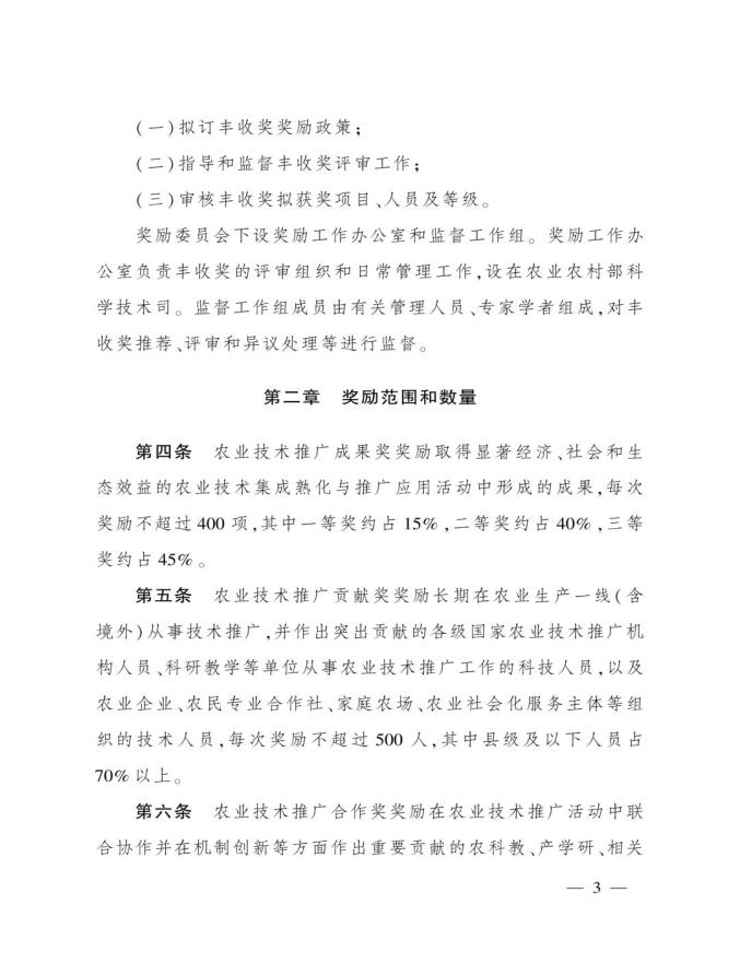 《奖励办法》指出,丰收奖是农业农村部授予在农业技术推广活动中表现突出的集体和个人的荣誉。其中3类奖项的定位如下:农业技术推广成果奖用于奖励在农业技术集成熟化与推广应用活动中取得显著经济、社会和生态效益的成果;农业技术推广贡献奖授予长期在农业生产一线(含境外)从事技术推广,并作出突出贡献的各级国家农业技术推广机构人员、科研教学等单位从事农业技术推广工作的科技人员,以及农业企业、农民专业合作社、家庭农场、农业社会化服务主体等组织的技术人员;农业技术推广合作奖则奖励在农业技术推广活动中联合协作并在机制创新等方面作出重要贡献的农科教、产学研、相关组织等合作团队。