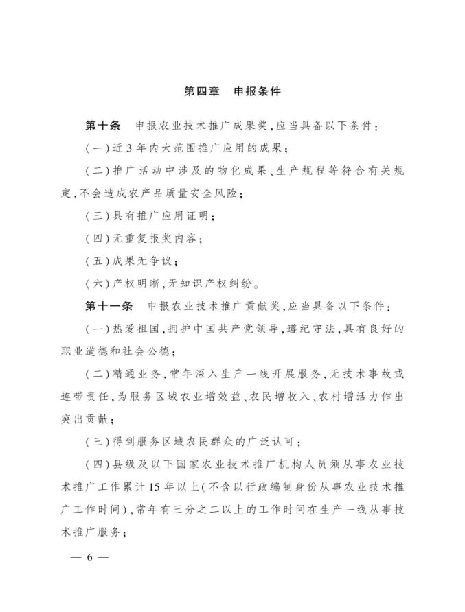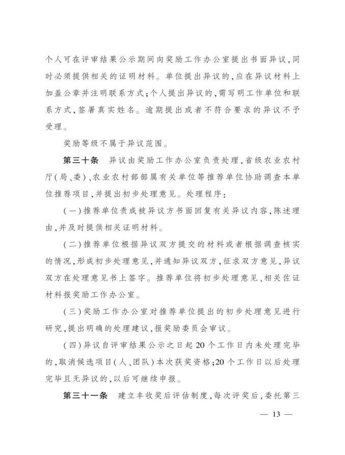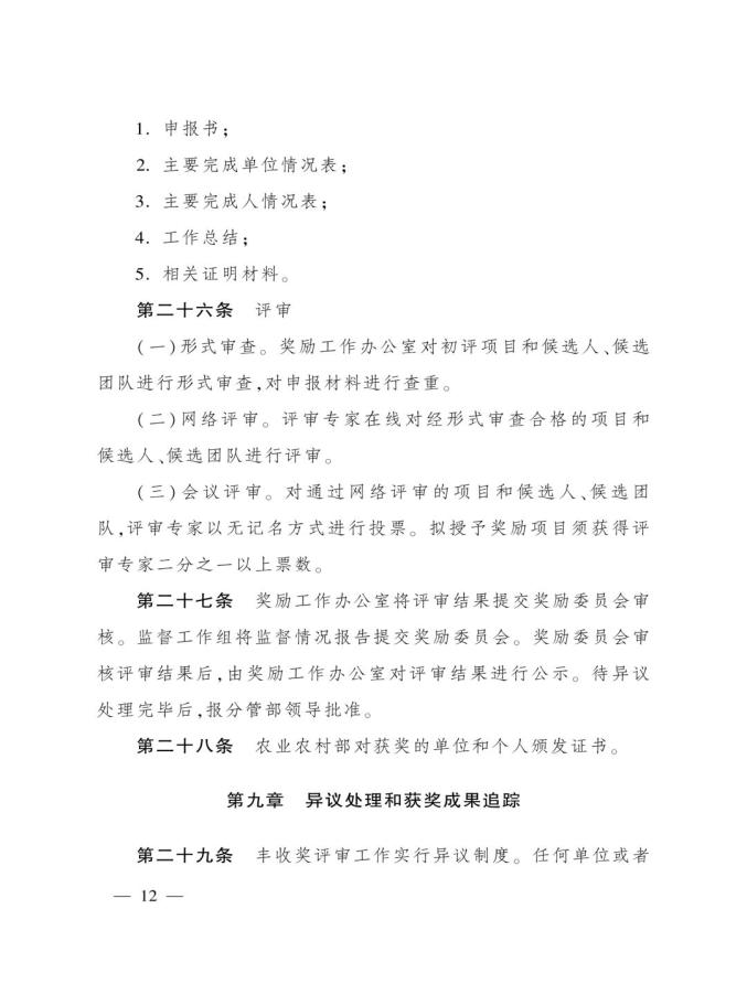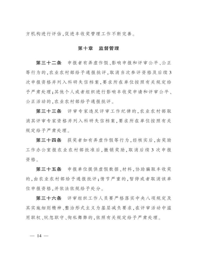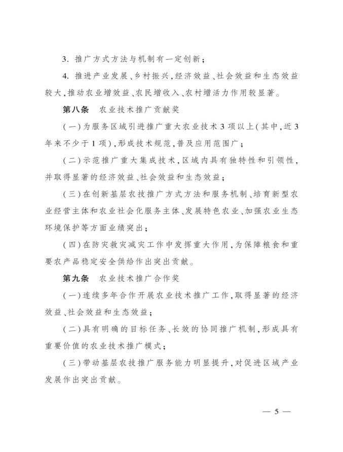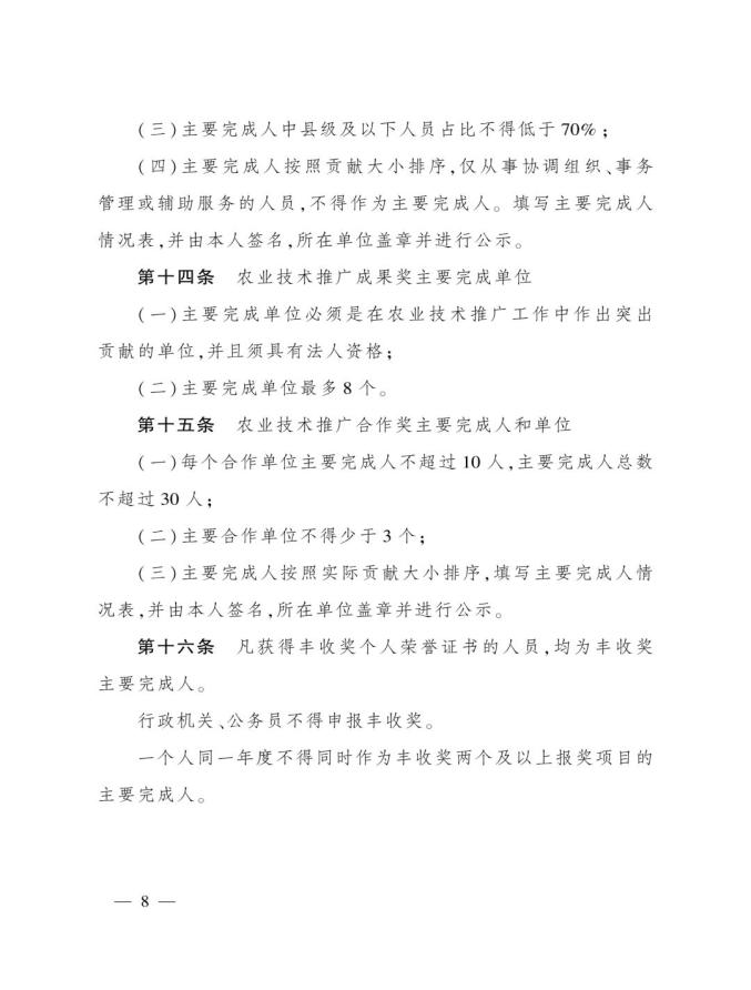 《奖励办法》指出,丰收奖是农业农村部授予在农业技术推广活动中表现突出的集体和个人的荣誉。其中3类奖项的定位如下:农业技术推广成果奖用于奖励在农业技术集成熟化与推广应用活动中取得显著经济、社会和生态效益的成果;农业技术推广贡献奖授予长期在农业生产一线(含境外)从事技术推广,并作出突出贡献的各级国家农业技术推广机构人员、科研教学等单位从事农业技术推广工作的科技人员,以及农业企业、农民专业合作社、家庭农场、农业社会化服务主体等组织的技术人员;农业技术推广合作奖则奖励在农业技术推广活动中联合协作并在机制创新等方面作出重要贡献的农科教、产学研、相关组织等合作团队。
