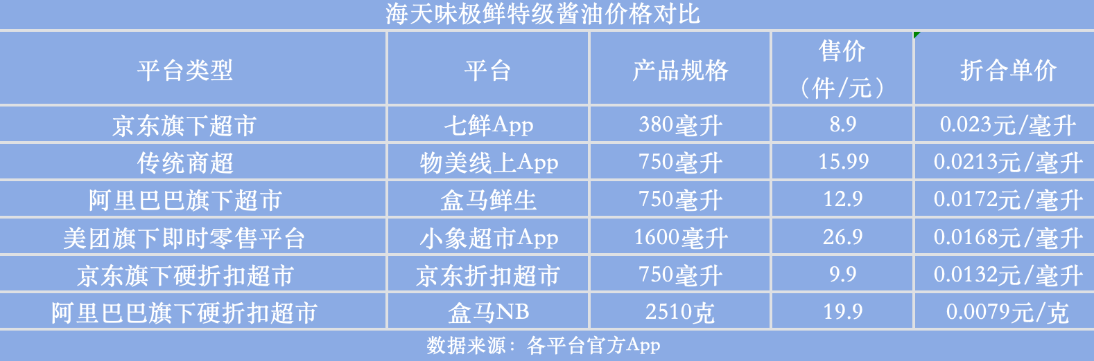 快消品也有低价优势。以海天味极鲜特级酱油为例,七鲜380毫升装售价为8.9元;小象超市1.6升装为26.9元;盒马鲜生和物美750毫升装的价格分别为12.9元、15.99元。而京东折扣超市线上平台的海天味极鲜特级酱油750毫升仅售9.9元,盒马NB推出的2.51千克大桶装售价仅19.9元,价格明显低于其他超市。
