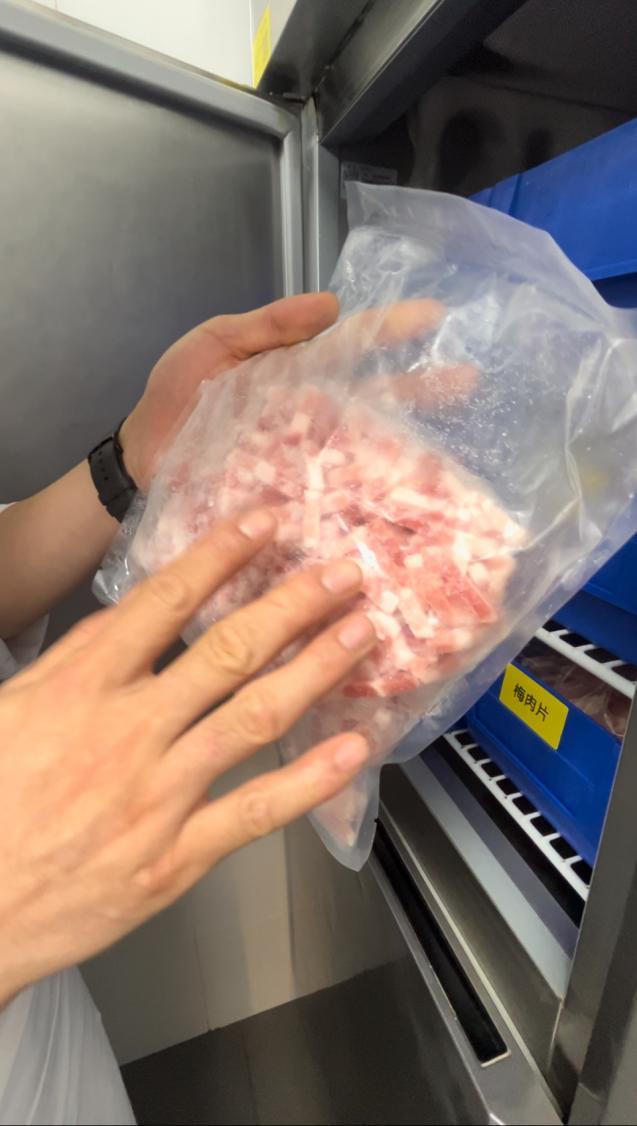 门店厨师长:如果这个做法不合格,它就不会流入市场。你看这个牛肉,生产时间是2025年的8月21号,保质期虽然是两年,但用不了那么久,今天就能用6袋 - 7袋肉,从中央厨房到店两三天就能消化完。