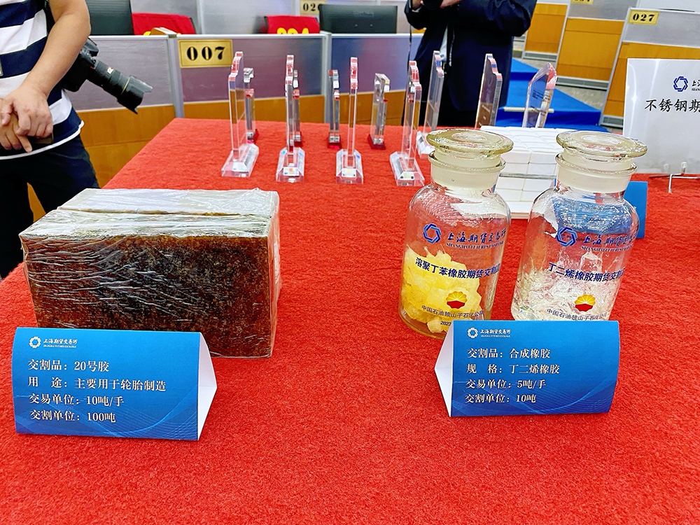 上海期货交易所展示的原20号胶、合成橡胶期货样品。澎湃新闻记者 俞凯 图