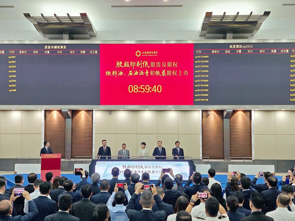 2025年9月10日,胶版印刷纸期货及期权,燃料油、石油沥青和纸浆期权在上海期货交易所(下称上期所)正式挂牌交易。上期所供图