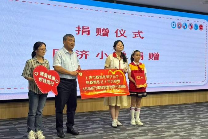 活动现场展示了2025年以来,区红十字会在杨浦全区普及应急救护知识和技能、积极推进应急救护实事项目等工作成果。与此同时,同济小学将学生爱心义卖所得善款捐赠给杨浦区红十字会人道救助基金,用于帮扶困难群体和支持救助事业。区红十字会也向五角场街道红十字服务总站捐赠了一批应急救护培训器材,为社区深入开展救护培训提供了有力支持。