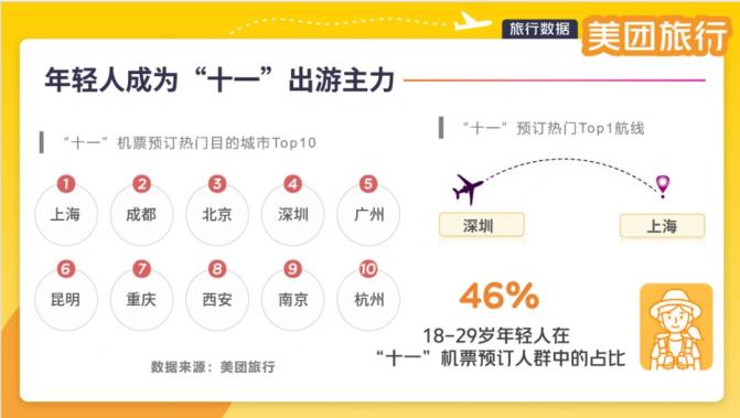 “十一”临近,假期氛围日益浓厚。美团旅行数据表明,今年“十一”假期机票预订热门Top10目的地依次为:上海、成都、北京、深圳、广州、昆明、重庆、西安、南京、杭州。Top5热门航线分别是:深圳 - 上海、广州 - 上海、上海 - 广州、上海 - 北京、上海 - 深圳。