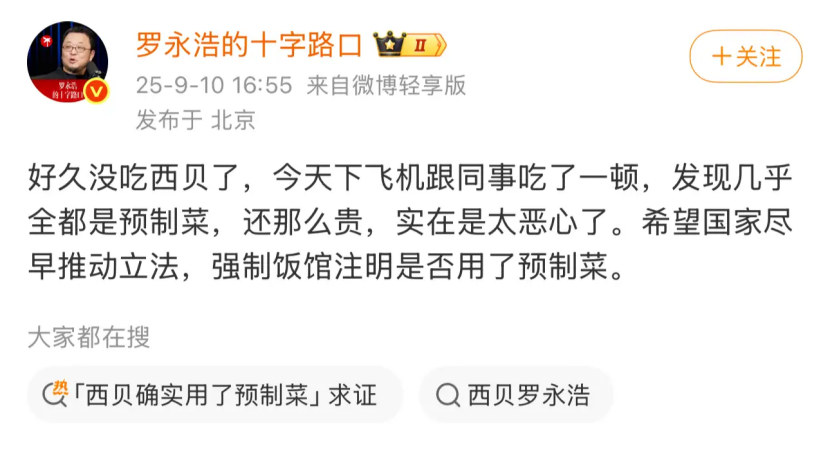 一夜之间,罗永浩、连锁餐饮品牌西贝莜面村(以下简称“西贝”)和预制菜一同登上了微博热搜。