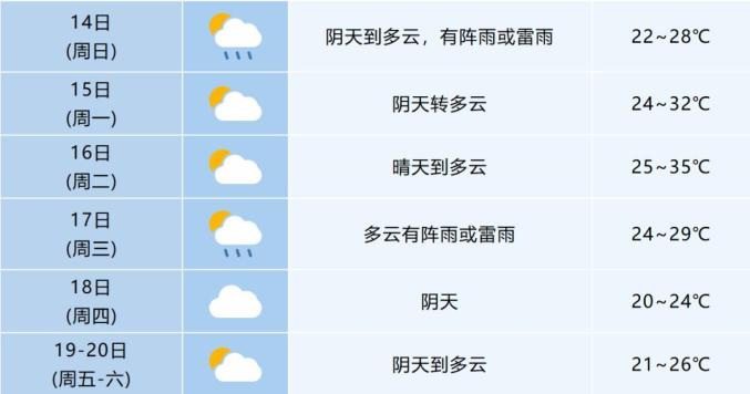 14日(周日):淮北地区多云到晴天;淮河以南阴天到多云有阵雨或雷雨,其中大别山区和江南部分地区中雨,局部大雨。