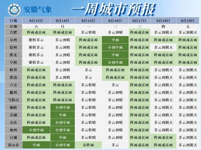 16日(周二):淮北地区多云到阴天有阵雨或雷雨,部分地区中雨;淮河以南多云到晴天。