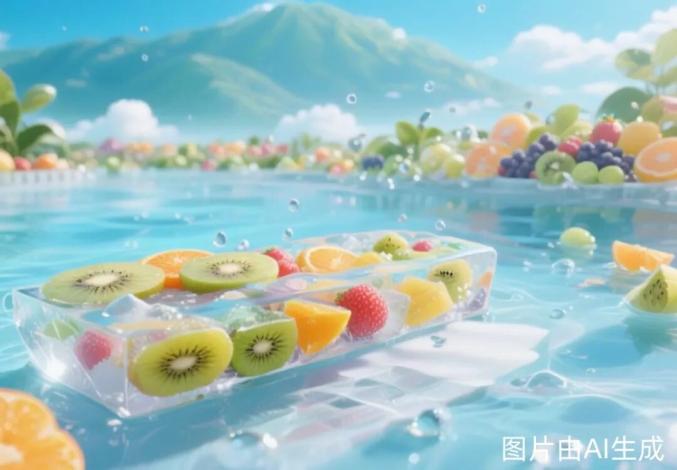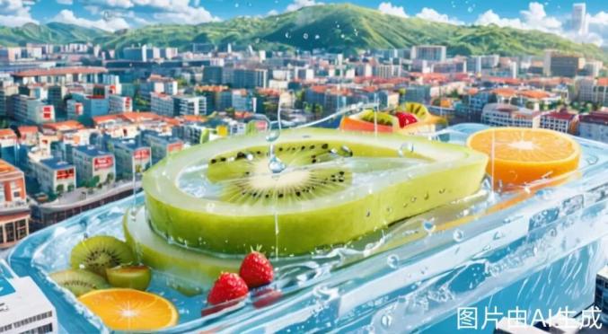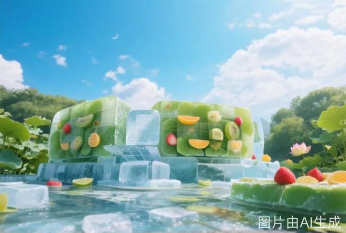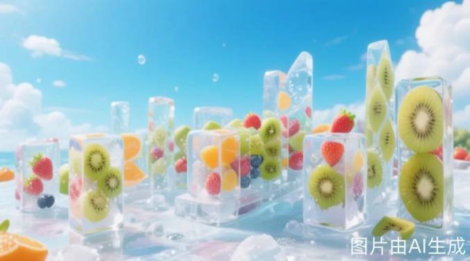 所有高楼仿佛“咔嚓”一声冻成了会跳舞的水果冰。玻璃幕墙上流淌着猕猴桃的光影,天台长出了草莓冰凌,在阳光下散发着甜蜜的香气。