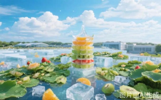 三江宝塔突然化作了玲珑的水果冰雕,柠檬瓣塔顶还冒着气泡,在阳光下熠熠生辉。猕猴桃、草莓、橙子层层堆叠,色彩斑斓,十分甜蜜。