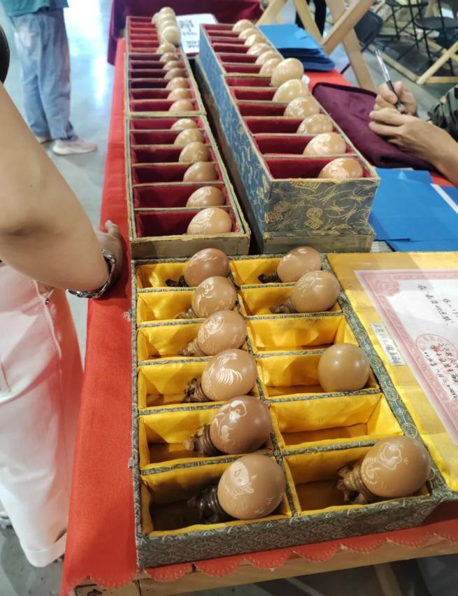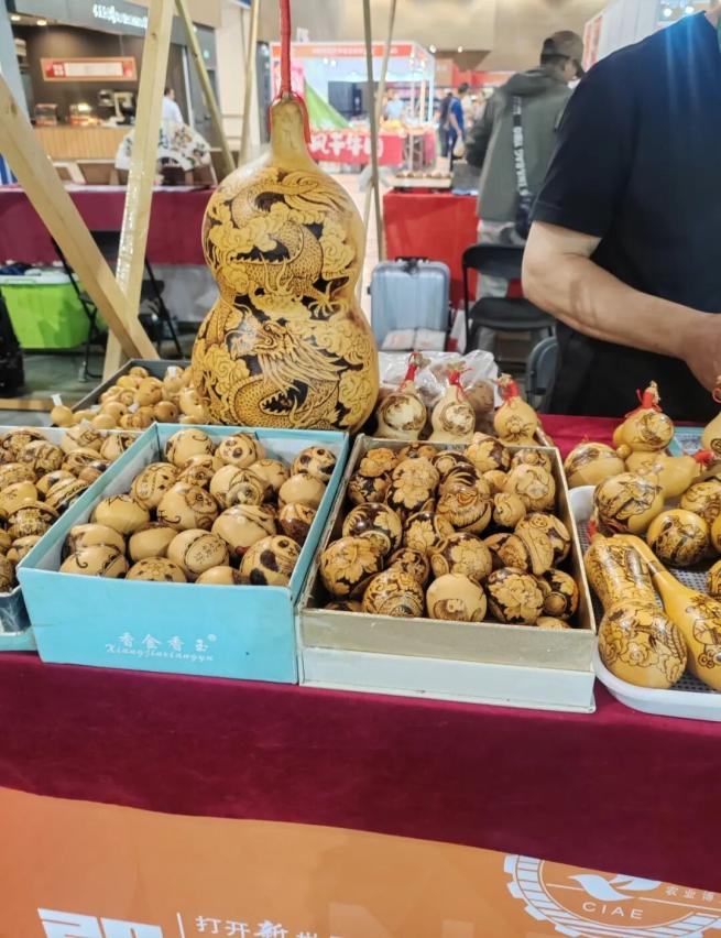 在展馆中段,一排古风小花车静静展示着“农业美学”。这是农博会首次引入的非遗文化市集,这里大部分是以农产品为主要原料的手工艺术。葫芦烙画、蛋雕等技艺在小物件上展现出艺术魅力,艺术家们以农作物为素材,一刀一烙间,把平凡食材变成了让人喜爱的艺术品。