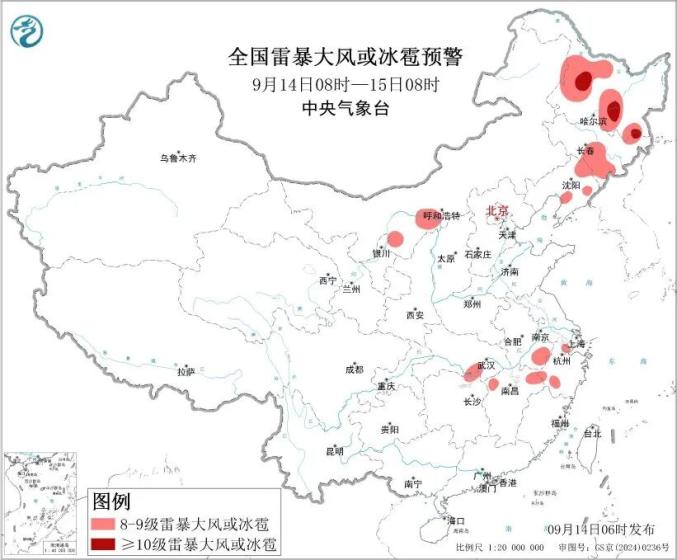 中央气象台9月14日6时继续发布强对流天气蓝色预警:预计9月14日8时至15日8时,内蒙古中西部、东北地区、江南北部等地的部分地区将有8级以上雷暴大风或冰雹天气,其中,黑龙江中部和东南部等地的部分地区将有10级以上雷暴大风;东北地区、华北西北部、江南北部、西南地区东部和西南部等地的部分地区将有小时雨量大于20毫米的短时强降水天气,其中,重庆东南部、贵州西南部等地的部分地区小时雨量大于50毫米,最大可达60毫米以上。