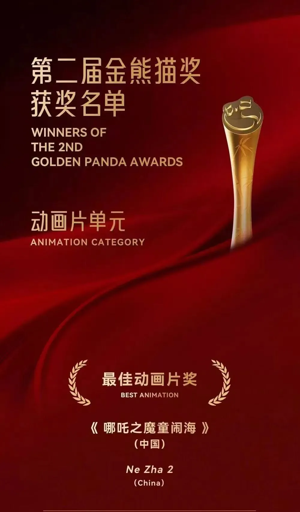 9月13日,第二届金熊猫奖的重点活动——金熊猫盛典于四川成都盛大举行,27个奖项逐一揭晓。其中,由成都高新区企业成都可可豆动画影视有限公司主创的动画片《哪吒之魔童闹海》(Ne Zha 2)荣获第二届金熊猫奖动画片单元最佳动画片奖。