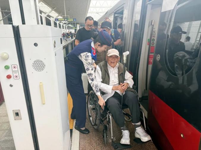 9月10日,从北京西发往洛阳龙门的G805次高铁列车上,一位百岁老人和家人一同乘车,受到了郑州客运段高铁一队京郑四组乘务人员的精心照料。