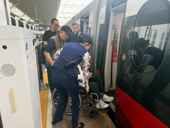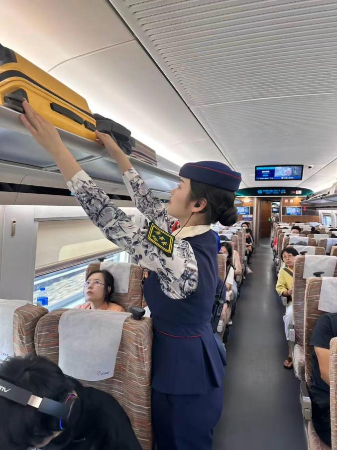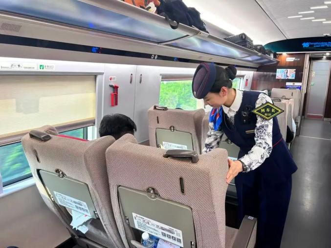 列车行驶途中,她又告知老人及其家人卫生间位置,帮助老人调节好座椅,以缓解久坐带来的旅途疲劳感。