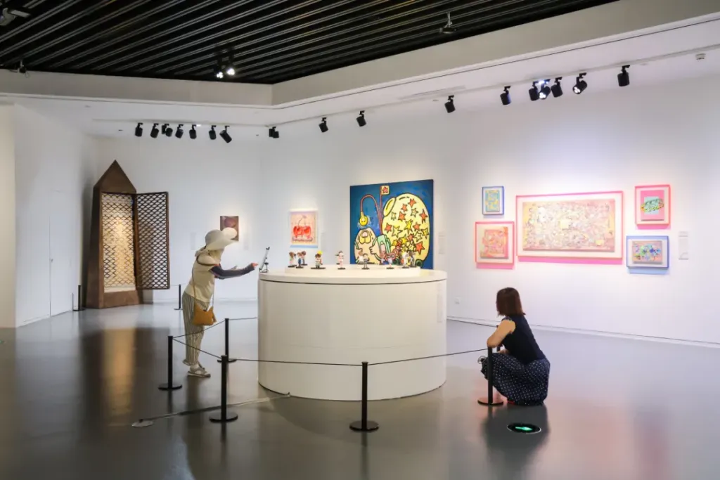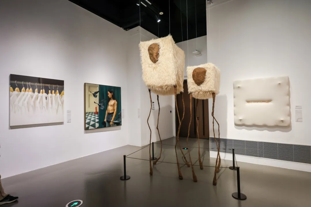 展览还摒弃了传统的中线对齐法则,采用上部或下部对齐的方式,使大小不一的作品高低错落,展厅内呈现出一种“跳跃感”。这种布展方式与青年艺术家作品中满满的新奇活力相得益彰。