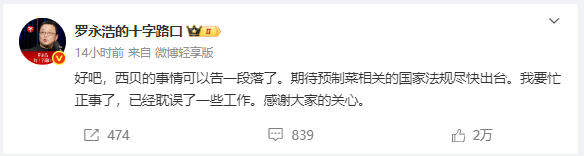 最新消息称,9月13日晚,罗永浩发微博称:“好吧,西贝的事情可以告一段落了。期待预制菜相关的国家法规尽快出台。我要忙正事了,已经耽误了一些工作。感谢大家的关心”。