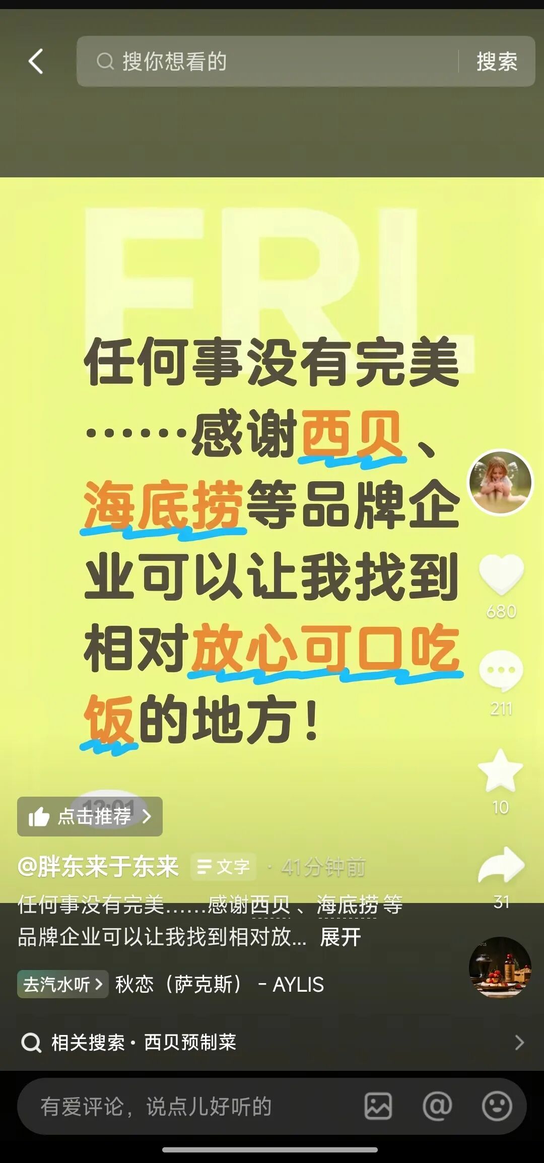 就在刚刚,胖东来创始人于东来在抖音为西贝“站台”,他表示:“任何事没有完美…感谢西贝、海底捞等品牌企业让我吃到相对放心可口到的地方。”其中西贝、海底捞、放心可口三个关键词重点标注。对此,舆论场瞬间炸开了锅。