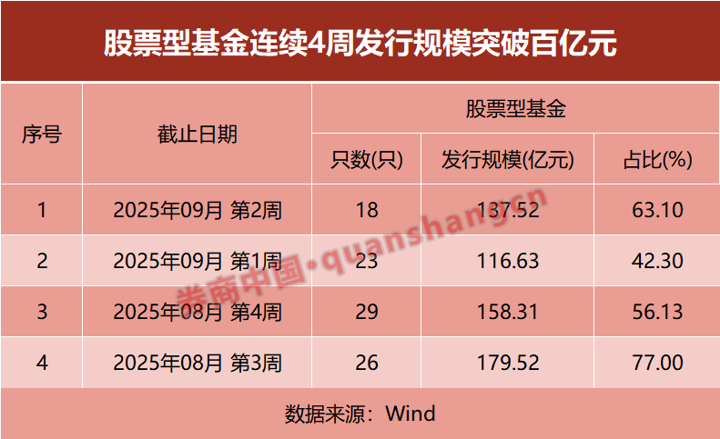 据Wind数据统计,9月第二周(9月8日至14日),公募基金新发市场持续回暖。该周共成立39只基金,总发行规模达217.94亿元,平均单只基金发行规模为5.59亿元。从产品类型看,股票型基金单周发行规模达137.52亿元,占总发行规模的63.1%,连续4周发行规模突破百亿元,这成为权益市场信心修复的重要信号。