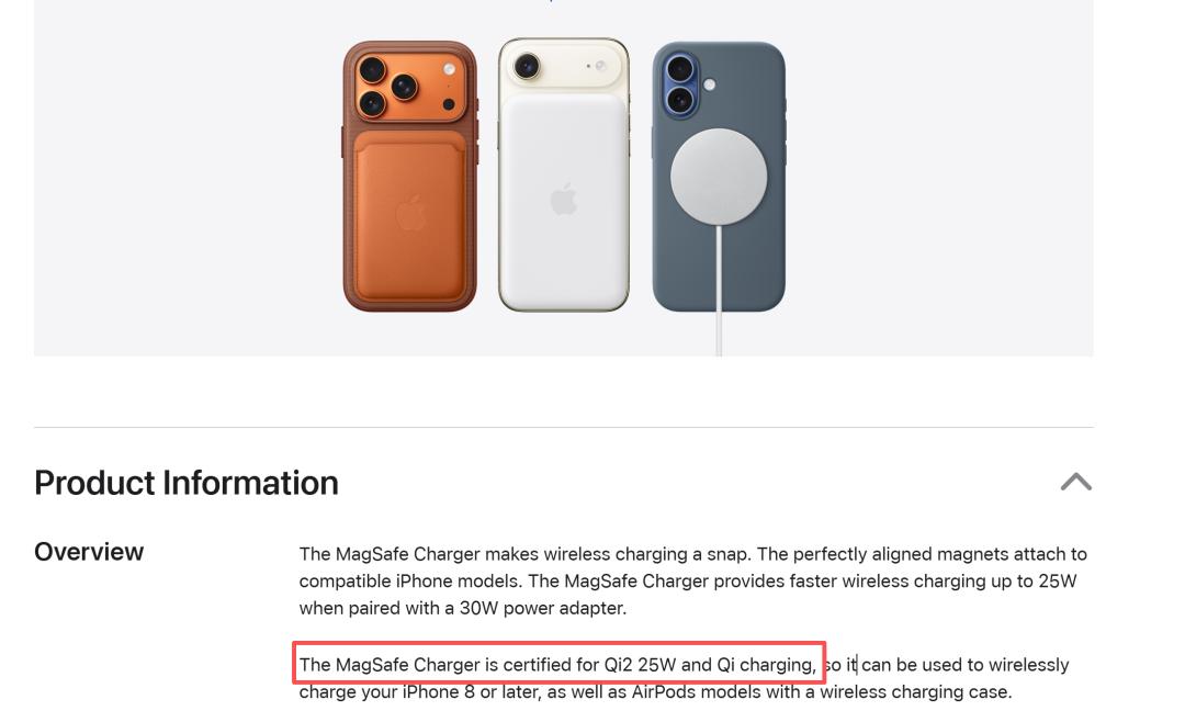 后来我研究了一下,发现外版的Magsafe充电器商品页明确写着:“通过了Qi2 25W认证”,而国行版仅标明了“兼容Qi充电”。