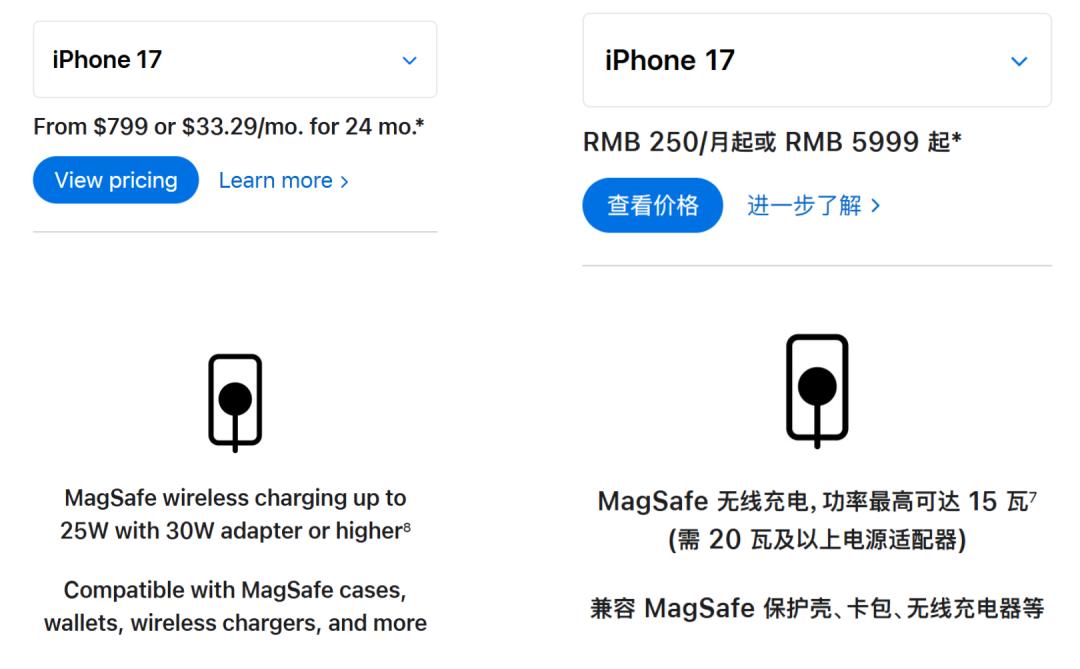 看完发布会后,我发现一个细节,国行和外版的iPhone 17在Magsafe充电功率上存在差异,国行是15W,而外版是25W。