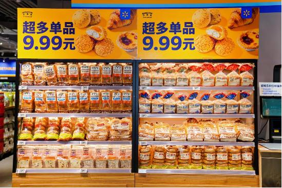 在深圳宝安万达广场一层临街处,沃尔玛社区店新店十分醒目。9块9的烘焙产品、带有“老广味”的烧腊窗口首先映入眼帘,蓝黄白搭配的明亮轻快视觉风格,让人忍不住驻足。