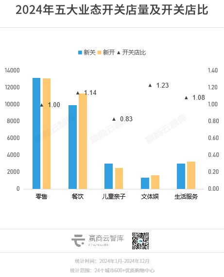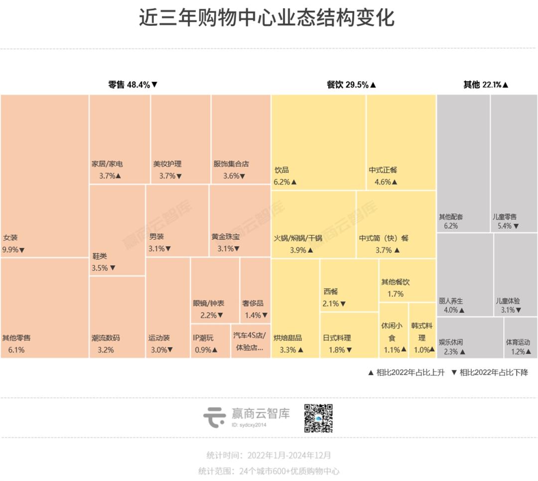 据赢商大数据统计,对比2022年业态结构,2022 - 2024年,24个城市600 + 优质购物中心餐饮业态占比从27.4%增至29.5%。购物中心餐饮品牌调整频次高,2024年餐饮业态开店、关店总计1.8万家,开关店比1.14,调整门店数占整体业态31%。