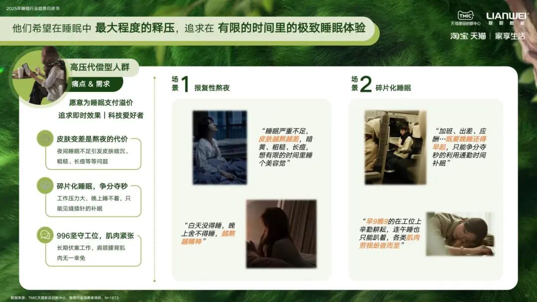 高压代偿型群体是抢夺时间碎片的「碎片捕手」。加班让他们难以拥有完整的睡眠,零碎补眠又常常让人越睡越累。他们青睐具有即时助眠功能的科技产品,并且愿意为高品质的枕头和套件支付更高的价格。智能化体验、改善肩颈问题、减压、驱蚊、凉感等有助于舒适入睡的功能,他们都十分看重。